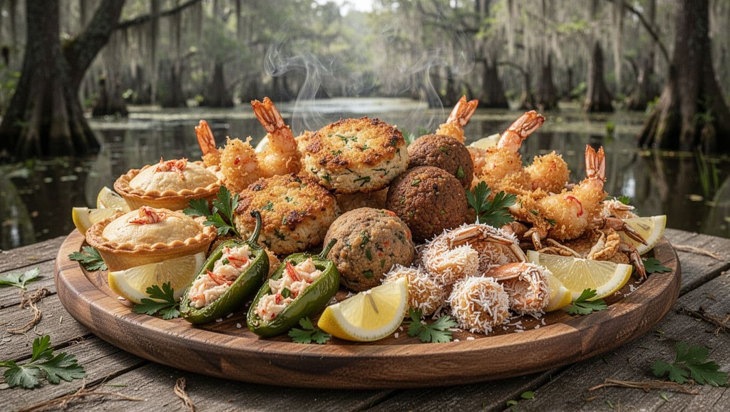Cajun beignets, boudin balls, alligator bites, and charbroiled oyster favorites